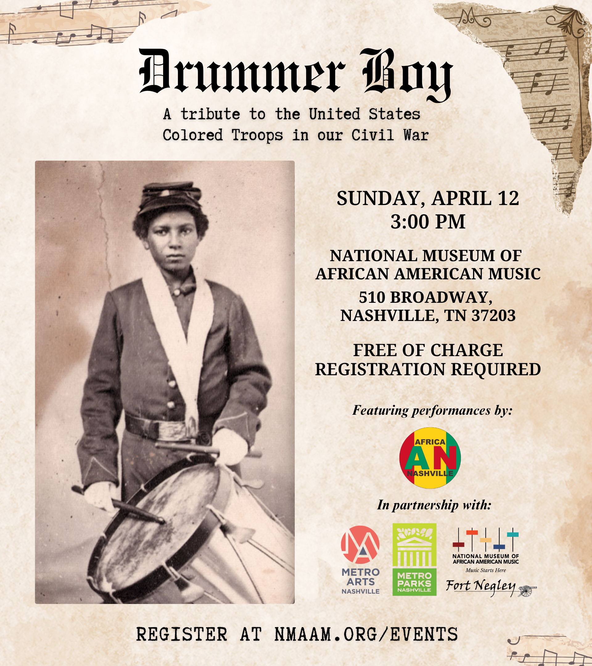 AfricaNashville, Fort Negley, and the National Museum of African American Music present: Drummer Boy Drummer Boy honors the bravery of Black soldiers who played a decisive role in the outcome of the US Civil War. It acknowledges the fierce legacy of their African ancestors and the real, hard challenges these men and women faced to […]